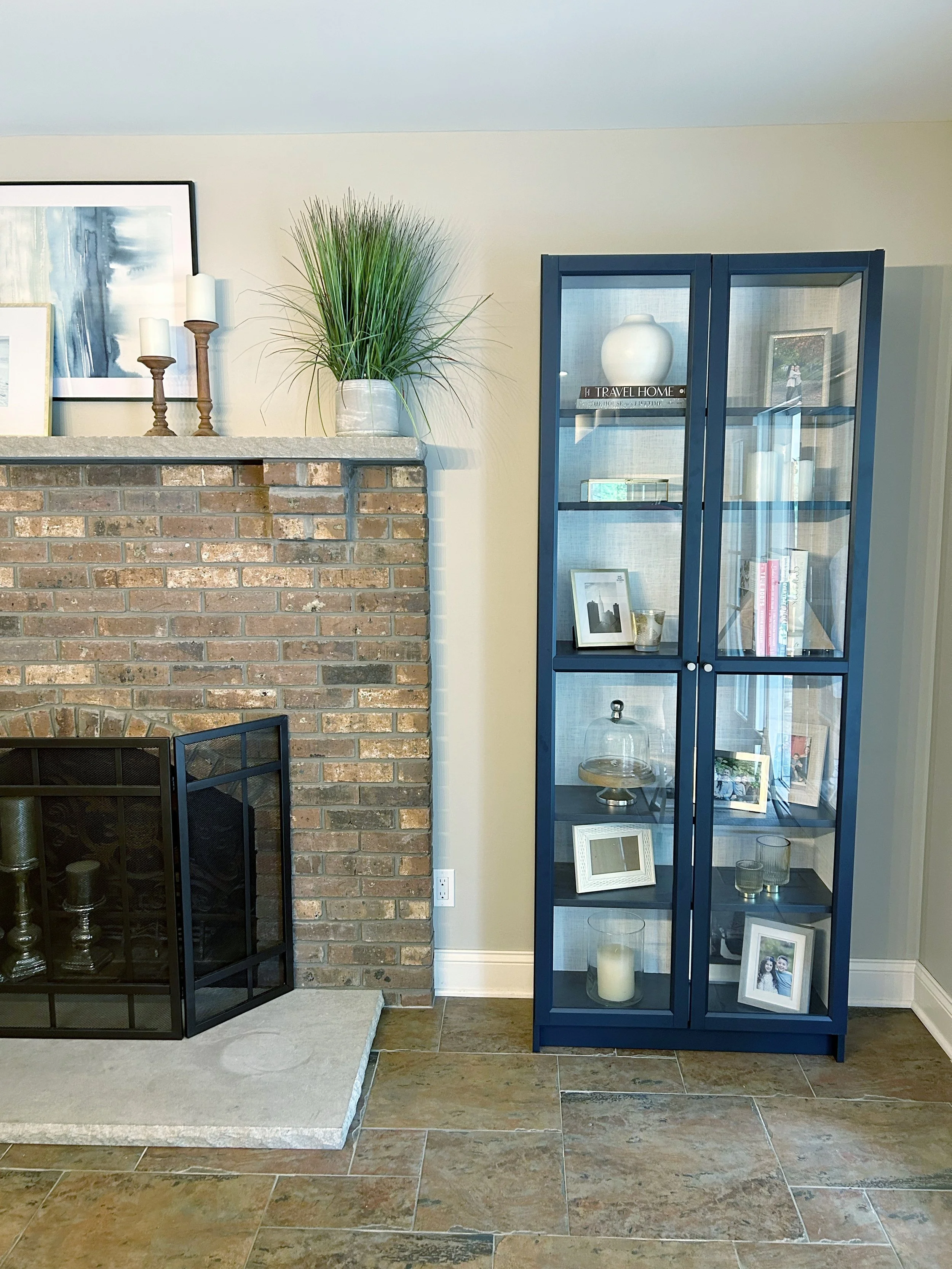 Before we came into Project Laurier we had a beautiful, untouched wall of the dining area with a fireplace and blank side spaces. A fresh coat of paint in Simply White by Benjamin Moore still needs to happen in a few weeks, but we felt this space was pretty ready to be shown off! We added a cozy seating nook that can be accompanied by a cocktail or just coffee and a good book. Then we had to show off family photos + cook books but in a budget friendly way. Stay Tuned for the following post focused on how we turned an IKEA Billy Cabinet into a beautiful upscale cabinet that we swoon over.