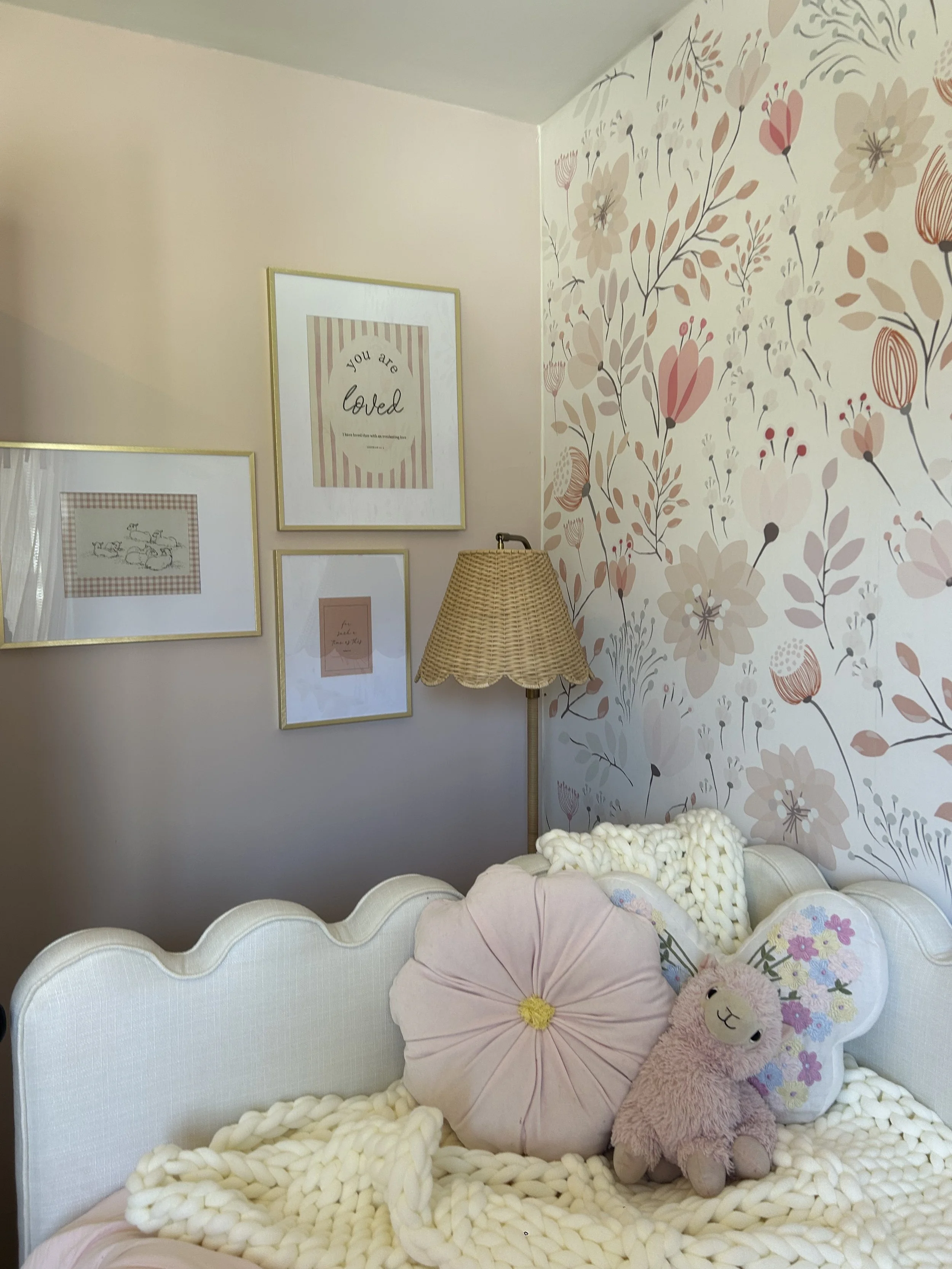 Layering textures and patterns is an easy and fun way to create a unique space. We enjoyed leaning into whimsical floral layers that are playful, yet sweet and calming, in this design project. We created an inviting, cozy vibe with tasteful decor to make the perfect sanctuary for a daughter, that’s no longer a baby, but not yet a teen so she can continue to grow in this space for years to come.