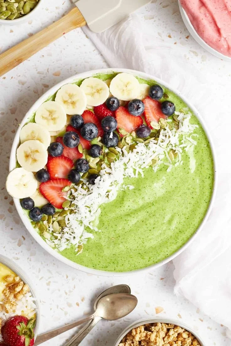 The easiest way to nurture your body is by nourishing it with powerful superfoods! This smoothie bowl is packed with healthy fats, fiber + protein. It also features ingredients in season this month - avocado, spinach + berries.