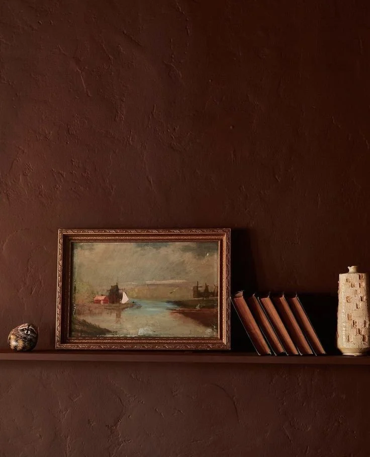 Painting with Hasbrouck Brown by Benjamin Moore - HC-71 - gives richness to any room. With red undertones, this mahogany brown strikes the perfect balance between spice, warmth + drama. Pair it with warm neutrals, other earth tones like rust or mustard yellow to bring out more of it’s characteristics or mix in contrasting blues + greens to give your space more depth and vibrancy. This color demands authority and has versatility - moody, grounded or sophisticated, you decide.